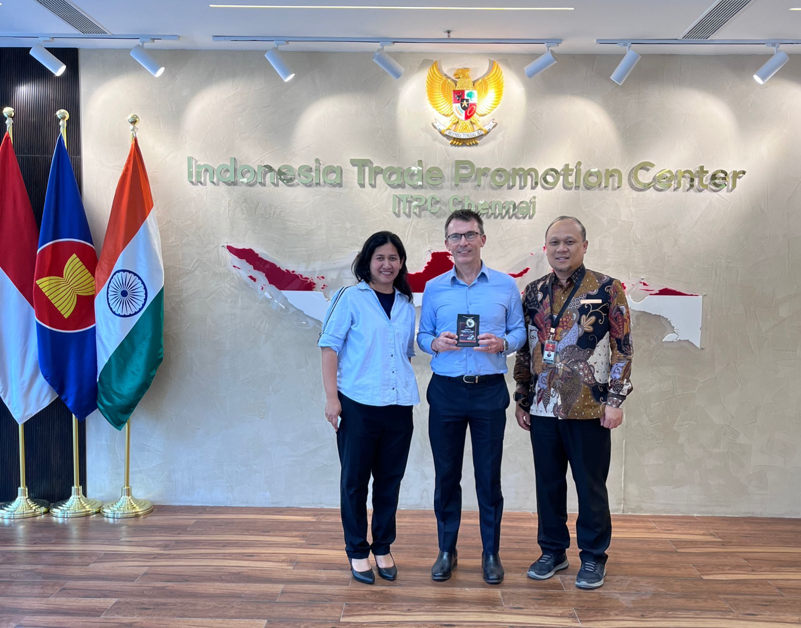 ITPC Chennai menerima kunjungan kehormatan dari Deputy Consul General Australia Mr Cameron Noble pada tanggal 23 Februari 2026. Kunjungan ini bertujuan untuk mempererat hubungan kerja sama perdagangan dan investasi antara Indonesia dan Australia, khususnya dalam memperluas peluang kolaborasi bisnis di kawasan India bagian selatan. Dalam pertemuan tersebut, membahas potensi peningkatan ekspor produk unggulan Indonesia dan Australia, penguatan jejaring pelaku usaha, serta peluang kerja sama strategis. Kepala dan Wakil Kepala ITPC Chennai menyampaikan apresiasi atas kunjungan tersebut dan menegaskan komitmen ITPC Chennai dalam mendorong peningkatan nilai perdagangan serta membuka akses pasar yang lebih luas bagi produk Indonesia. Beliau juga menyampaikan harapannya agar komunikasi dan koordinasi antar perwakilan perdagangan dapat terus ditingkatkan guna mendukung pertumbuhan ekonomi yang inklusif dan berkelanjutan. Pertemuan berlangsung dalam suasana hangat dan konstruktif, serta diakhiri dengan pemberian cenderamata berupa kopi bubuk arabica dari Sumatera Utara dan sesi foto bersama.