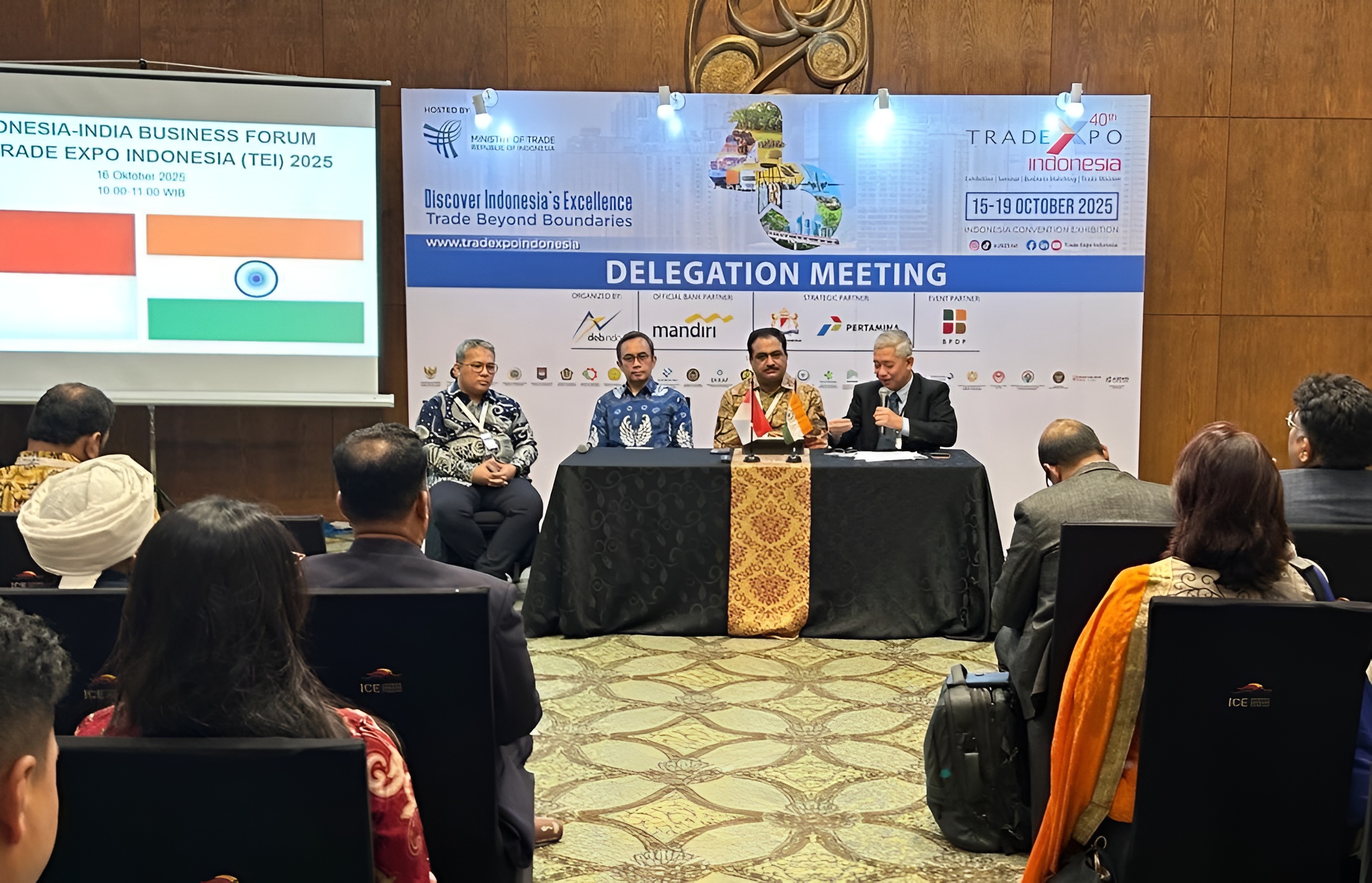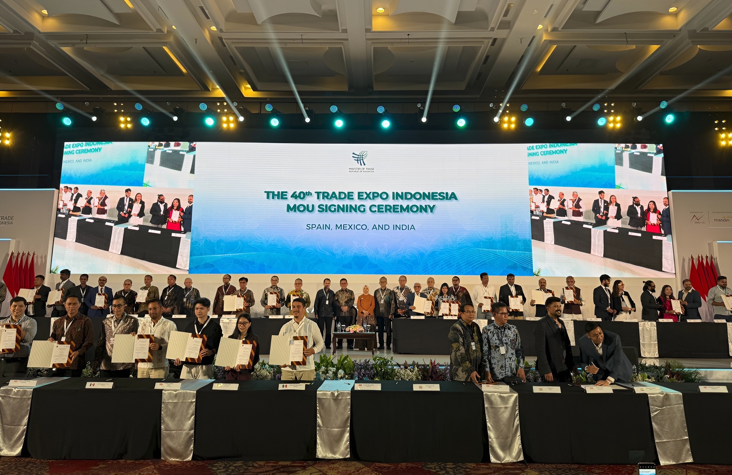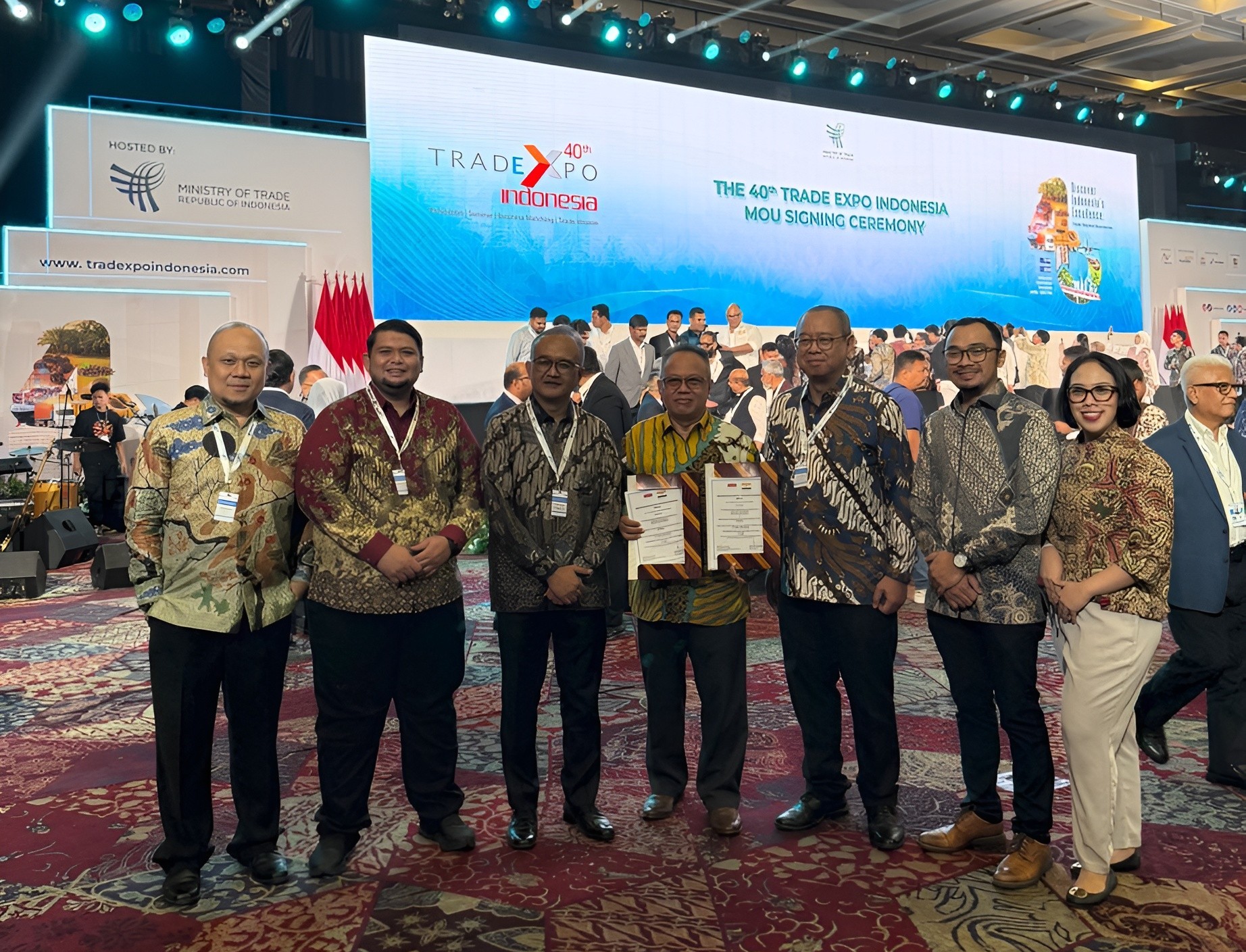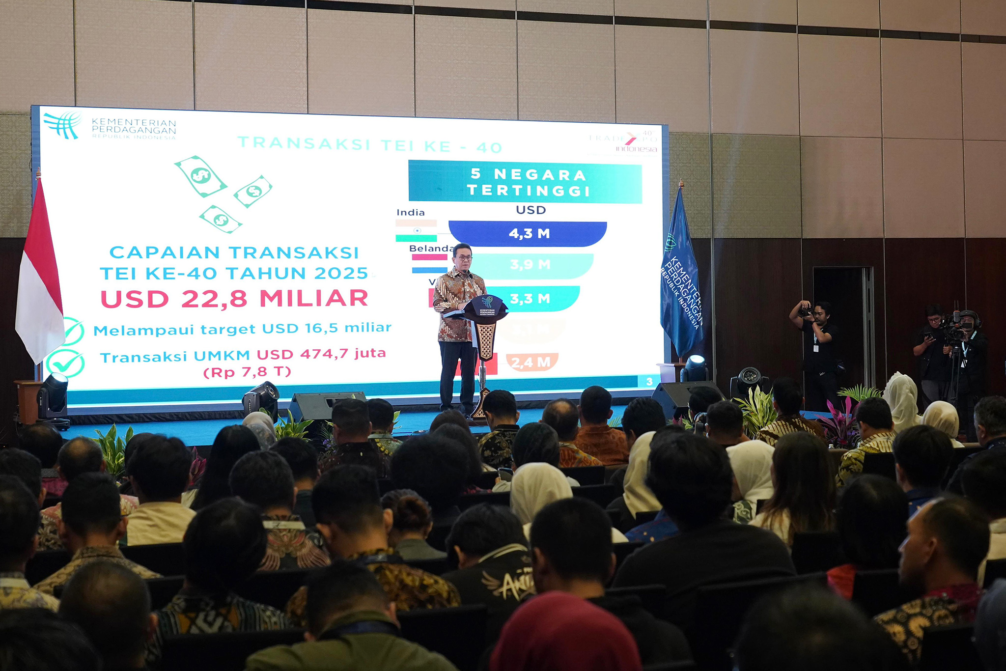 Menteri Perdagangan Budi Santoso resmi menutup perhelatan Trade Expo Indonesia (TEI) ke-40 Tahun 2025 di Indonesia Convention Exhibition (ICE), BSD, Kab Tangerang, Banten pada Minggu (19/10). Hingga jelang penutupan pukul 13.00 WIB mencatatkan capaian membanggakan dengan nilai transaksi total mencapai USD 22,80 Miliar atau setara dengan Rp 376,20 triliun, melampaui target awal sebesar USD 16,5 miliar. Selama lima hari penyelenggaraan, TEI 2025 dikunjungi 34.550 orang dari 131 negara. Khusus buyer luar negeri, tercatat sebanyak 8.045 orang dari 130 negara dengan jumlah terbanyak berasal Malaysia dengan 769 buyer, Tiongkok 605 buyer, India 594 buyer, Nigeria 509 buyer dan Mesir 406 buyer. Sementara untuk jumlah peserta pameran mencapai 1.619 perusahaan, lebih tinggi dari target 1.500 peserta. Dari sisi transaksi, perdagangan barang mencatat USD 17,90 miliar, perdagangan jasa USD 443,70 juta, dan investasi USD 4,37 miliar. Transaksi ini terdiri atas nota kesepakatan (MoU) senilai USD 22,70 miliar, transaksi di area pameran (fairground) sebesar USD 71,60 juta, dan penjajakan kerja sama bisnis (business matching) senilai USD 63,40 juta atau naik 88 persen dibandingkan 2024. Di TEI ke-40, negara dengan transaksi tertinggi adalah India (USD 4,30 Miliar), Belanda (USD 3,90 Miliar), Vietnam (USD 3,30 Miliar), Filipina (USD 3,10 Miliar), dan Tiongkok (USD 2,40 Miliar). Sementara produk paling diminati meliputi produk pertambangan senilai USD 5,50 Miliar, Logam Mulia (USD 2,70 Miliar), Minyak Kelapa Sawit dan turunannya (USD 2,30 Miliar), Arang dan Briket (USD 1,60 Miliar), serta Suku Cadang (USD 1,40 Miliar)